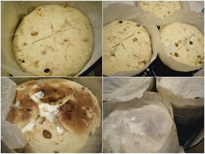 7. Imparte aluatul in 3. Da-le forma de minge apoi pune-le pe cite un disc de hirtie de copt, uns cu unt si infainat. Cu o banda din aceeasi hirtie inconjoara aluatul creind un fel de cilindru(butoi). Cele 3 forme lasa-le sa stea 6 ore la loc caldut (eu le-am bagat si in cite-o oala, ca sa fiu sigura...!).