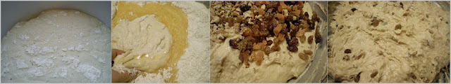 Drain the raising and dry them in a clean kitchen towel. Add all fruits and the zest into the dough, kneading the dough for 2-3 minutes until all is well combined.